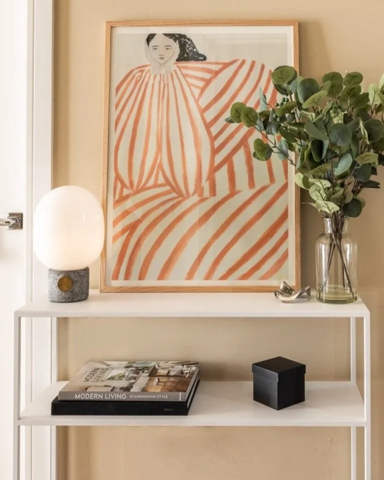 Minimalist interior decor with framed abstract art, table lamp, green plant in glass vase, and books on modern living on a white shelf.